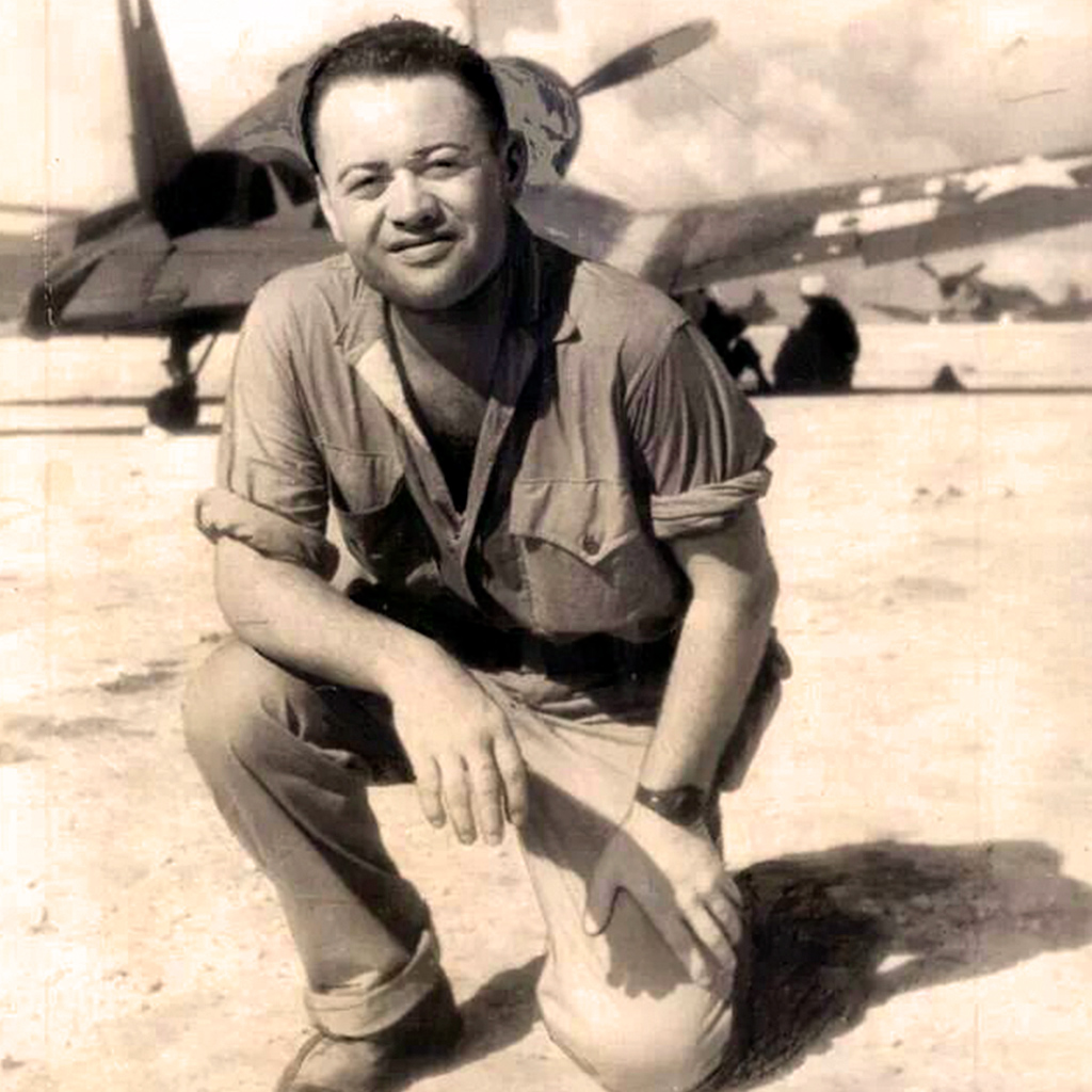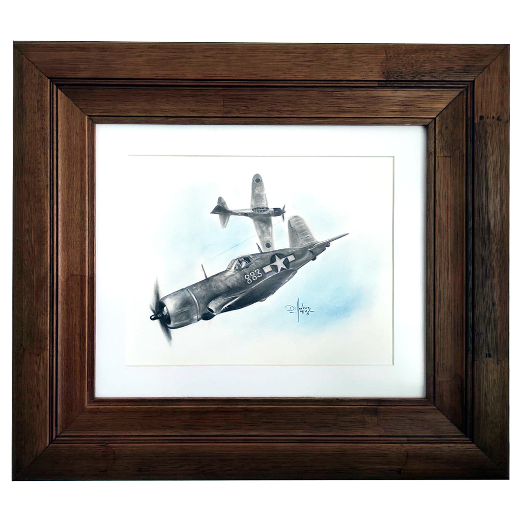 USMC Air Group 11 (MAG-11) – Guadalcanal – 1943. Gregory “Pappy” Boyington (4 de Dezembro 1912 – 11 de Janeiro 1988) foi um dos mais extraordinários pilotos de caça norte-americanos. Enquanto servia como instrutor em Pensacola, Boyington beteu em outro oficial e foi informado que provavelmente enfrentaria a corte marcial. Por um golpe de sorte, recrutadores estavam em busca de pilotos de caça voluntários para lutar na China e Boyington foi escolhido para fazer parte de uma Unidade Aérea Especial para defender a China e a Estrada da Birmânia (os famosos “Tigres Voadores”). Em setembro de 1942, ele voltou ao Corpo de Fuzileiros Navais e assumiu a comissão de major. Os americanos precisavam de pilotos de combate experientes e, no início de 1943, ele foi designado ao Grupo de Aeronaves de Fuzileiros Navais 11 da 1ª Ala de Aeronaves de Fuzileiros Navais e enviado ao Pacífico Sul como oficial executivo do Esquadrão de Ataque de Caça de Fuzileiros Navais 122 (VMFA-122) operando em Guadalcanal. Em setembro de 1943, “Pappy” tornou-se comandante do Esquadrão de Caça da Marinha 214 (VMF-214), mais conhecido como “Ovelhas Negras”. Greg Boyington era famoso por usar o Corsair mais surrado disponível, deixando as aeronaves mais novas ou recém-reformadas para os pilotos mais jovens e menos experientes.